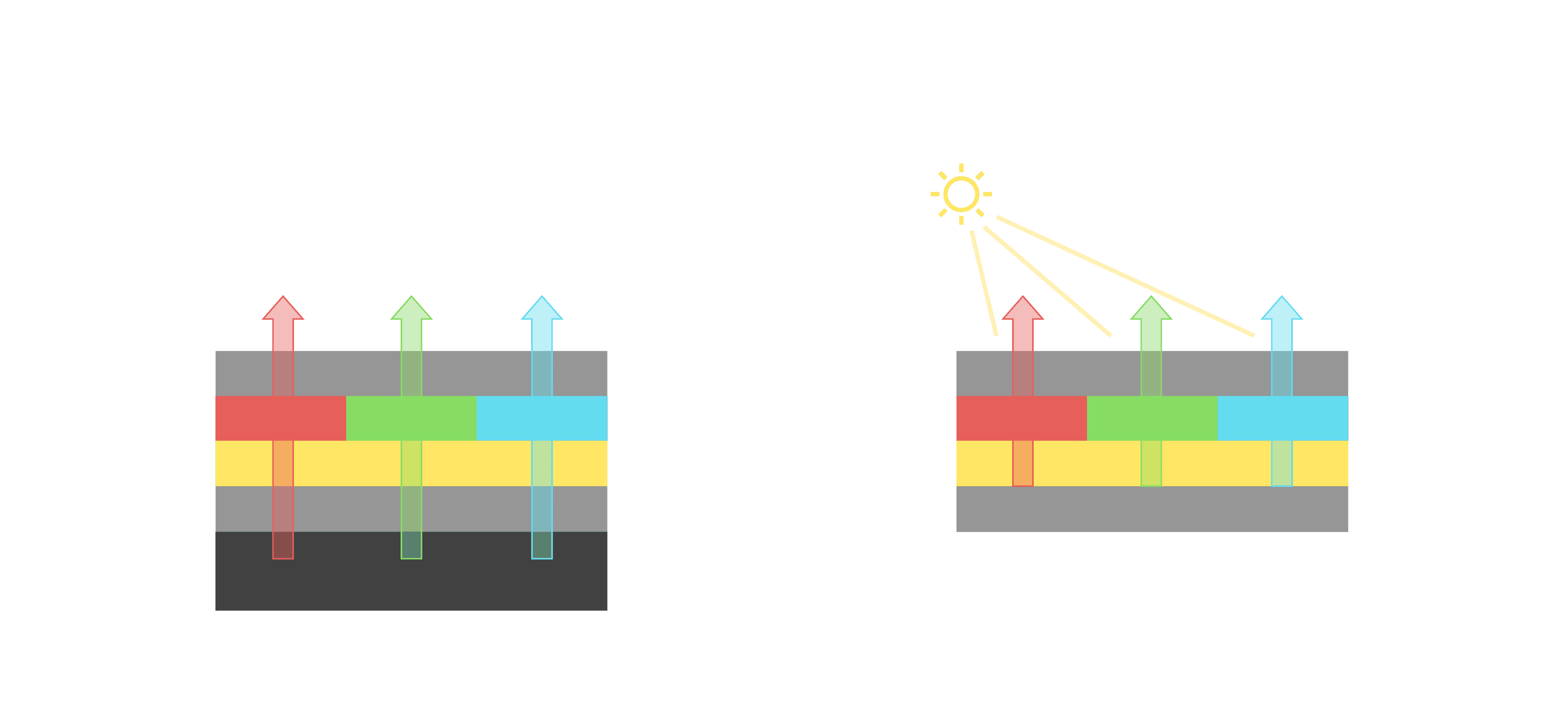 与传统需搭配背光单元的液晶显示相比,,反射式液晶技术不仅更省电、、、更轻薄,,且即便在艳阳下仍能清晰显示。。此外,,少了背光单元,,也大幅降低了 LED 蓝光伤害眼睛的疑虑。。。。